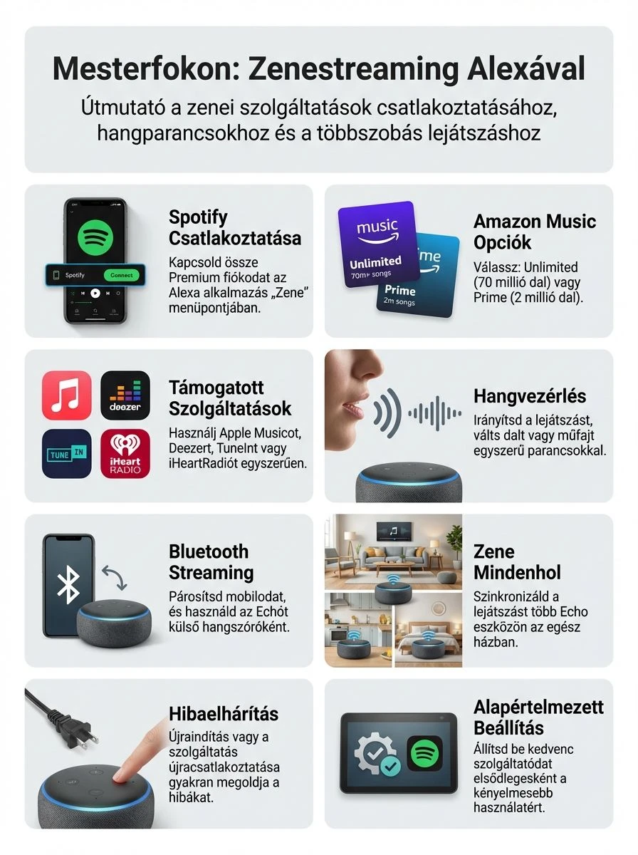 - Amazon Music Unlimited vagy Spotify Premium szükséges a zene lejátszásához több eszközön.